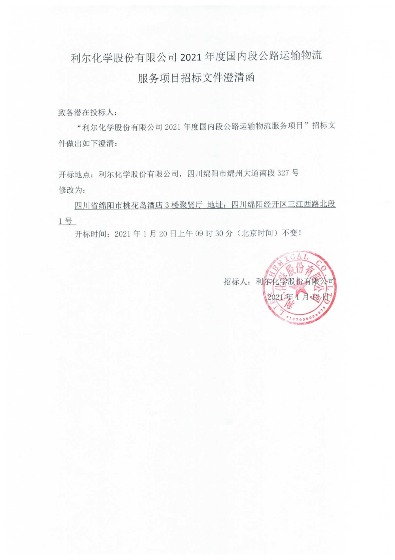 利爾化學(xué)股份有限公司2021年度國(guó)內(nèi)段公路運(yùn)輸物流服務(wù)項(xiàng)目招標(biāo)文件澄清函